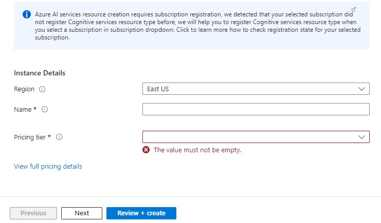 Click Next. In the instance details screen, enter the Region, Name and Pricing tier.