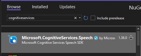 To use the speech services, you will need to first install the NuGet package Microsoft.CognitiveServices.Speech: