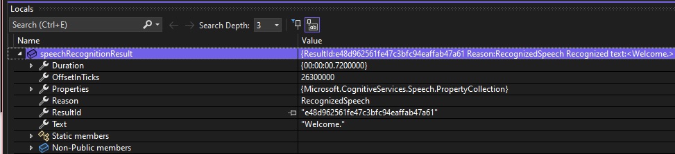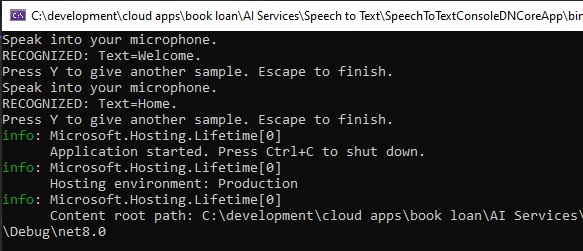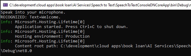 Console.WriteLine($"RECOGNIZED: Text={speechRecognitionResult.Text}");