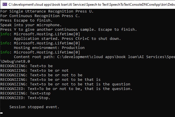 Note that in the Recognizing event handler, I provided a handy way to stop continuous recognition by ending when we utter the word (command) “stop”: