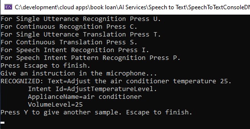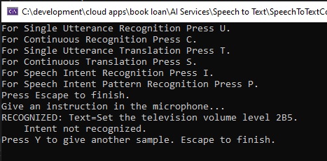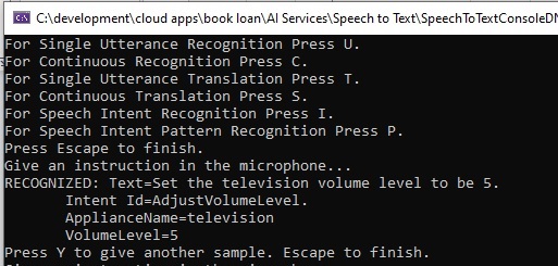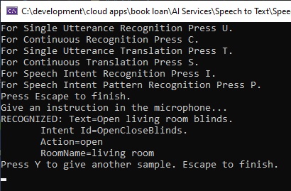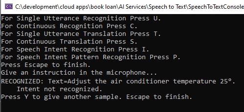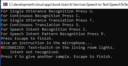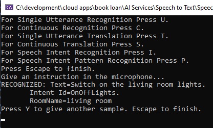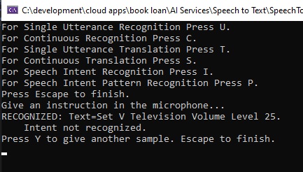 We then run the speech recognition using the familiar RecognizeOnceAsync() method of the IntentRecognizer class as shown: