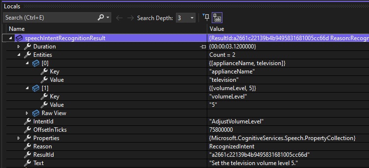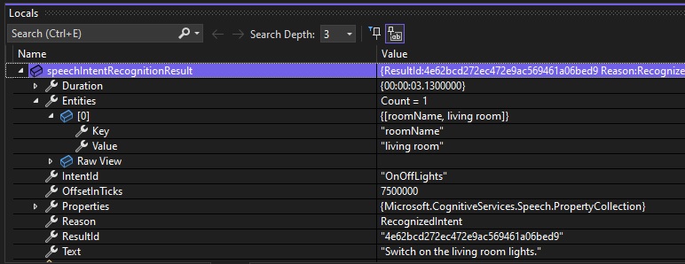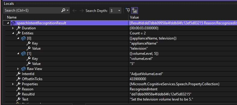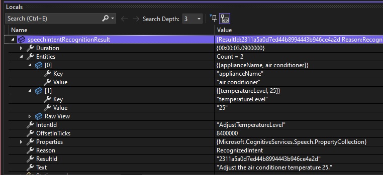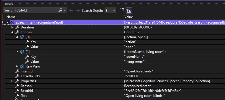 Below is a debug snapshot showing the IntentRecognitionResult instance with the IntentId, Entities and Text properties: