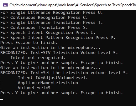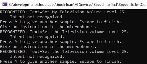The first attempt has been successfully recognised with the intent captured correctly. The above output assumes each word in the pattern is spoken clearly and above a minimum audible volume to be recognized by the speech recognition input passed into the microphone.