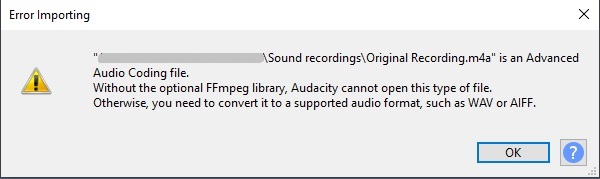 In the next section I will show how to resolve a common error that occurs when opening M4A audio format files in Audacity. If you don’t have any errors, then skip to the section where I show how to export the loaded audio file to a file in the WAV format.