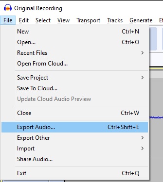 After launching Audacity, you will see a menu that allows you to open audio files, modify the audio file, then export (convert) the audio to a variety of different audio formats.