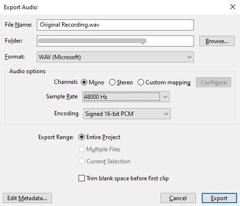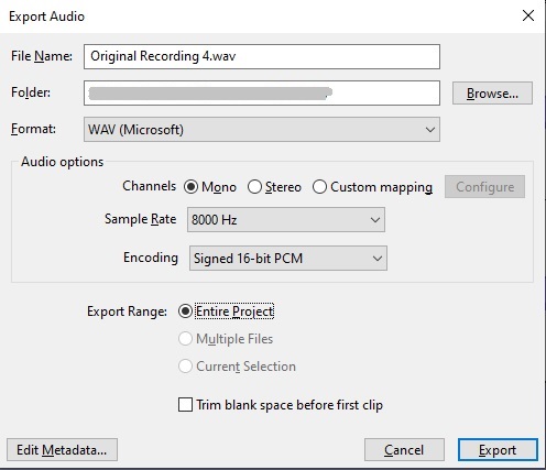 In the above dialog, I have selected the highest audio sampling rate of 48kHz with a Mono channel, and 16-bit PCM. When the file is exported, for a 6-second audio sample, the size of the WAV file is over 500kb.