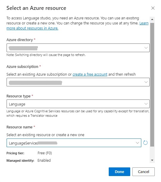 You will then be taken to a dialog that will require you to specify the resources, such as your Azure directory, Azure subscription, resource type (Language), and name of the Language Service resource you created earlier.
