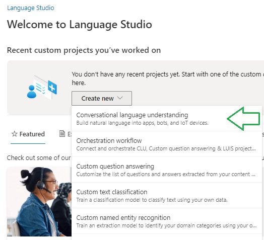 In the welcome screen, you will be able to select the language project type. For CLU projects, select the Conversational language understanding option as shown: