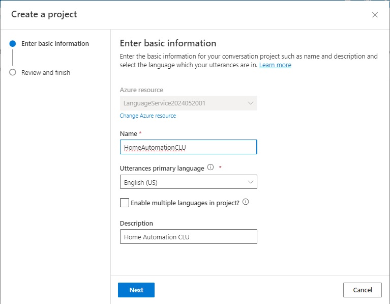 After selecting the project type, you will be taken to another dialog, where you will be required to enter the new project details such as the Name, Utterances primary language, and Description. It will default to the Azure Language resource that you selected when opening the Language Studio.