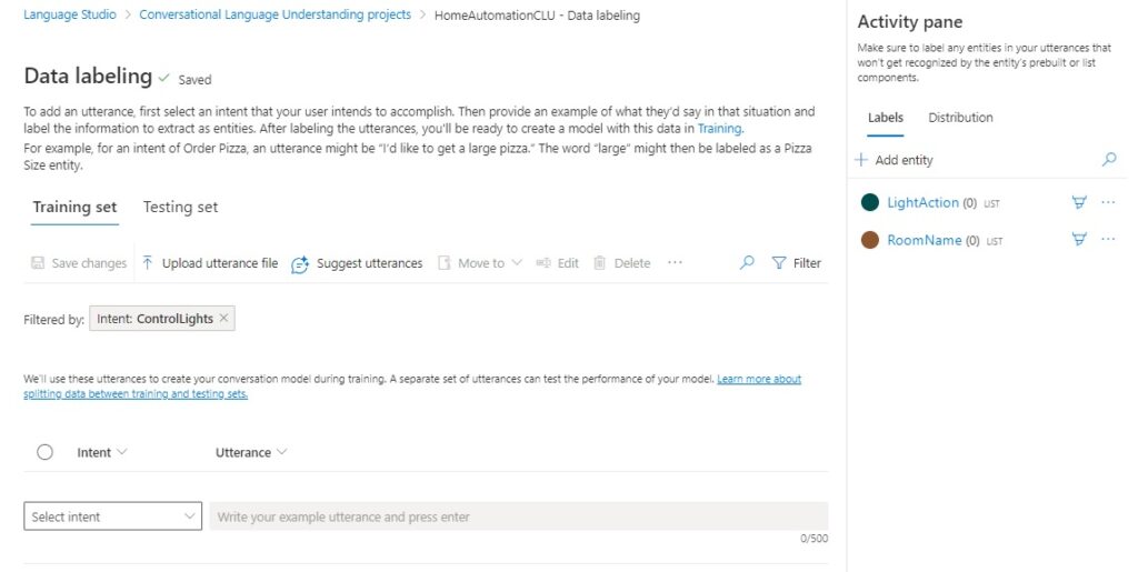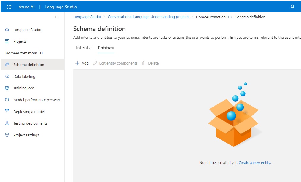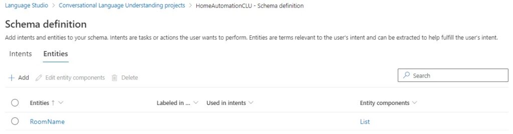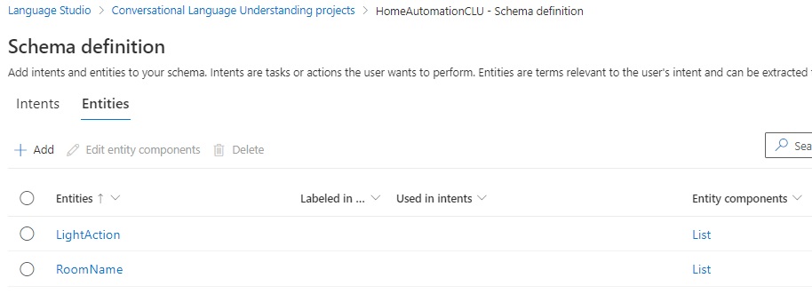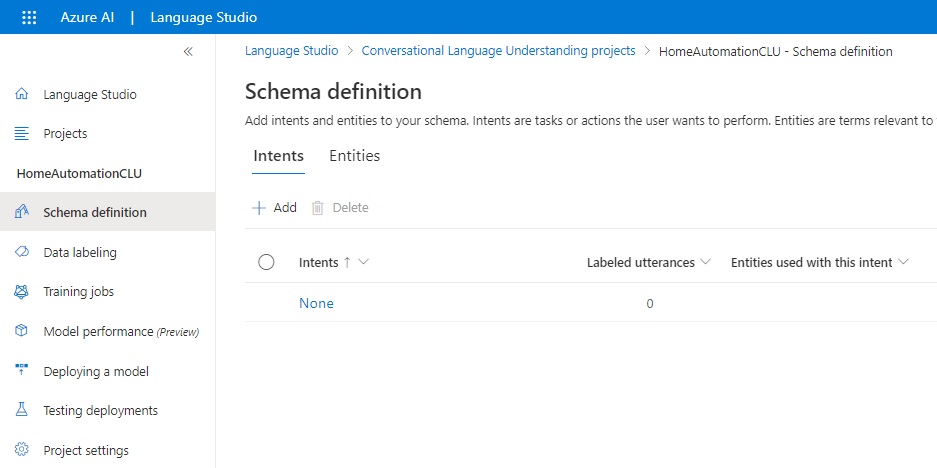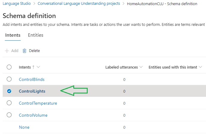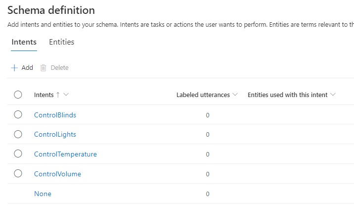 Each intent has no labeled utterances. This is something that we will add a little later. In the next section, I will show how to add Entities to our CLU model.