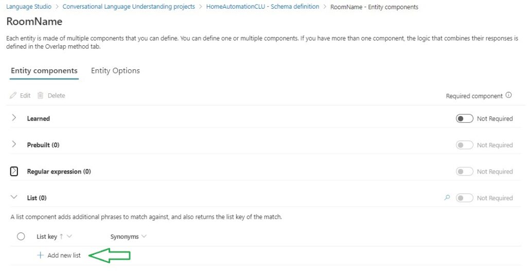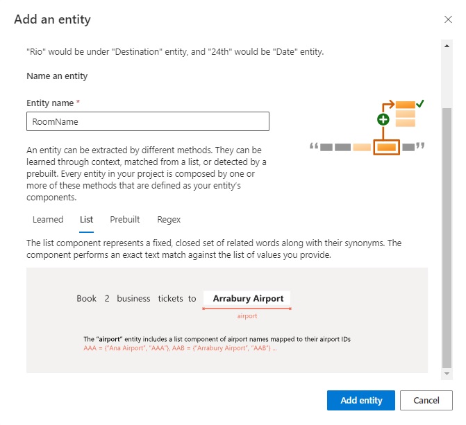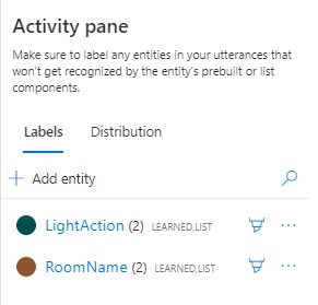 As the utterances I will be adding later will have two types of entities, a room entity, and an action entity, I will show how I add the second entity.