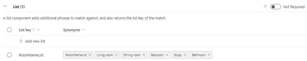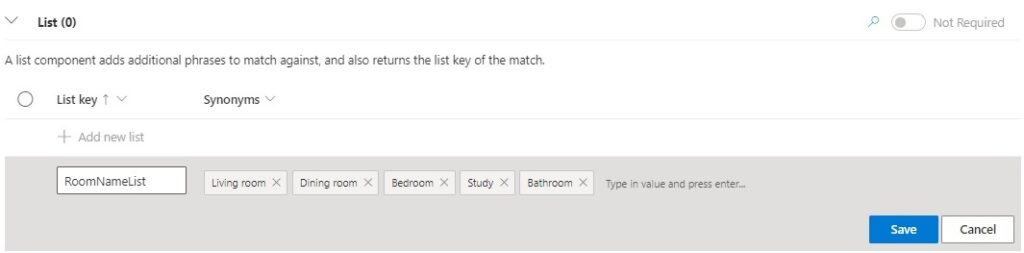 Enter a name for the list, then the values by typing in and pressing enter. Below is have named the entity list as RoomNameList with the values: