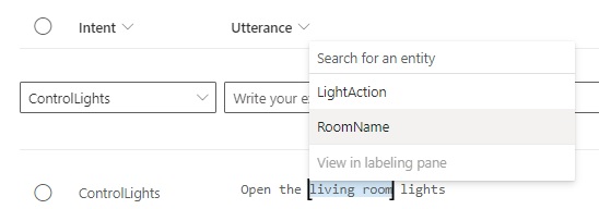 Another way to label utterances with entities is to click on the pencil icon next to the entity then selecting the word(s) in the utterance will float an entity tooltip above the selection, automatically assigning the selected word to the entity as shown: