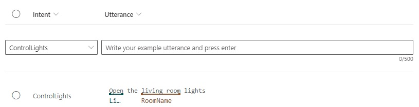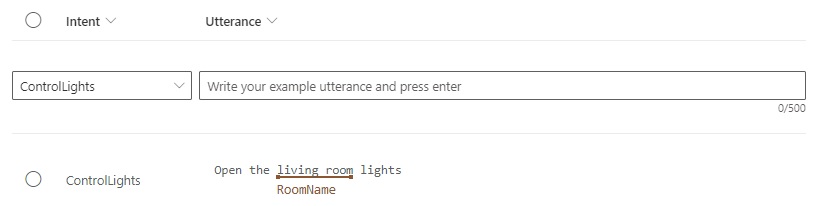 In the editable part of the page, from the Intent column, select the intent from the drop-down list you want to add the utterance for. In the Utterance column enter the utterance.