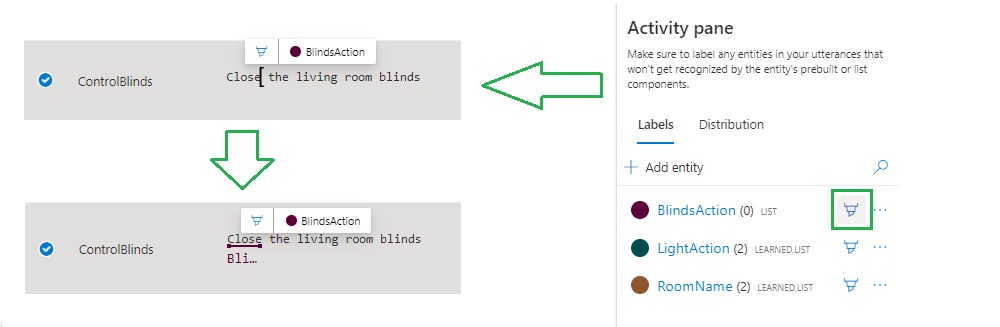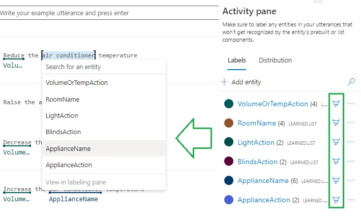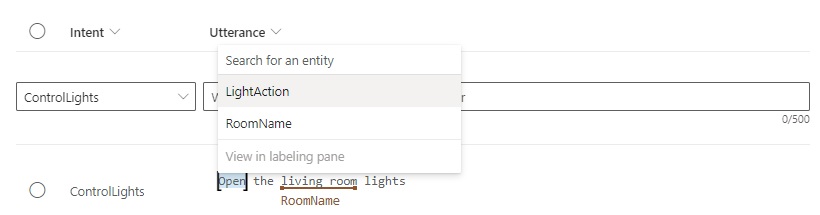 From the list, select an entity. You will then see the utterance display the selected word or words underlines in red with the referenced entity displayed under the word(s):