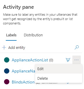 During the labeling activity, you may want to add additional entities while you are adding or editing utterances. To do this select the Edit option next to the entity in the Activity pane:
