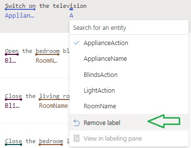 To remove an inaccurate entity reference from an utterance, select the labelled word(s). In the drop-down context menu, selecting the option Remove label will remove the reference: