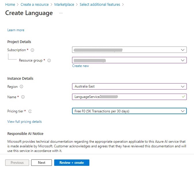 Before we can create a project within the Azure Language Studio, a Language Service resource will need to be created that will provide the storage for the language resources that we create within our project.