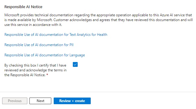 After accepting the responsibility of AI usage notice, hit Review + Create.