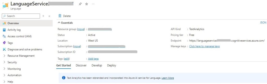 where service-name is the instance name of the language resource. In the resource overview, you will notice that the API Kind is of type TextAnalytics, which is different from SpeechServices, which is the API Kind used in an Azure Speech Service resource.